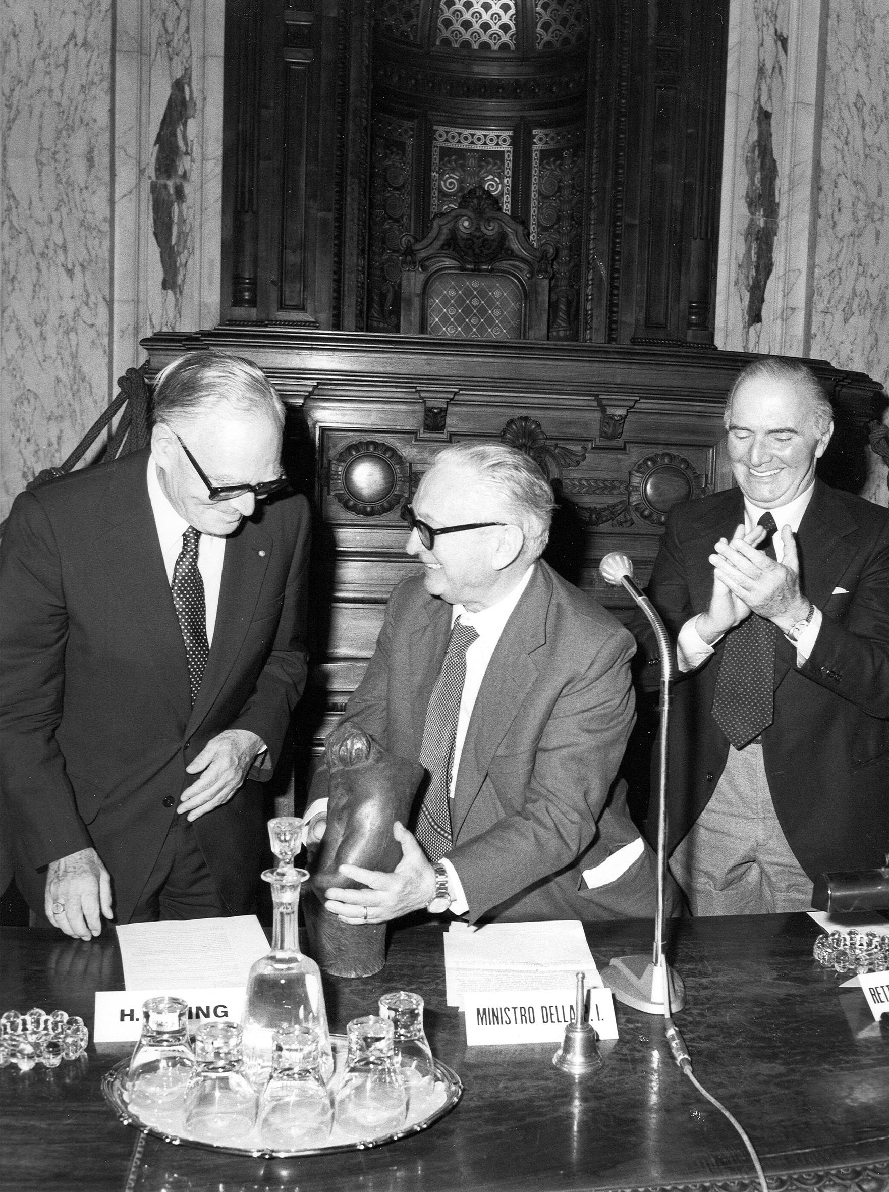Mi pare che l’influenza della scienza giuridica italiana sia senz’altro comparabile all’influenza dell’arte italiana, in particolare ai grandi modelli dell’architettura e della pittura del Rinascimento e del Barocco. A questo punto mi permettano di concludere con una osservazione personale. La mia attività scientifica è stata costantemente dedicata alla scienza giuridica, per una buona parte alla storia del diritto. La mia predilezione personale va tuttavia piuttosto all’architettura del Rinascimento e del Barocco italiani, va a un Brunelleschi, a un Bramante, a un Bernini. Io credo di far parte di quel grande numero di miei compatrioti tedeschi, che vedono nell’Italia una loro seconda patria ed è perciò con profonda commozione che ricevo questa onorificenza italiana.